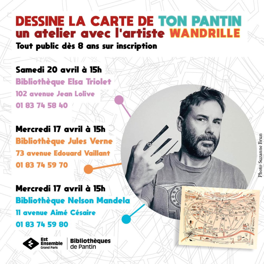 Ateliers "Dessine la carte de ton Pantin" avec Wandrille dans les trois bibliothèques de Pantin :