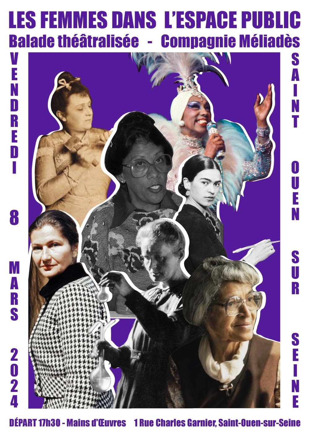 Méliadès propose une balade théâtralisée à travers Saint-Ouen pour redécouvrir les personnages emblématiques féminins de la ville. Leur guide vous mènera sur les traces de Joséphine Baker. Vous croiserez la petite fille de Dora Maar, photographe et une des adeptes de Emy Noether. D’autres personnages seront convoqués au cours de cette déambulation, Suzanne Valadon, Louise Michel, Séverine et la comtesse Cayla.