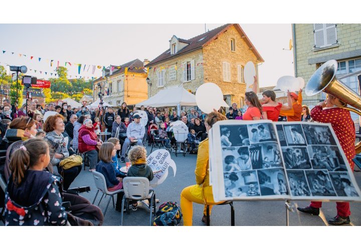 > Un cabaret insolite porté par une famille haute en couleurs s’installe dans la cour : avec leurs bulles échappées des cases de romans-photos, ils aiment à créer des rencontres et à célébrer en chansons, musique et en images bien vivantes, les initiatives locales réjouissantes comme autant de « bonnes nouvelles » à partager et cultiver.