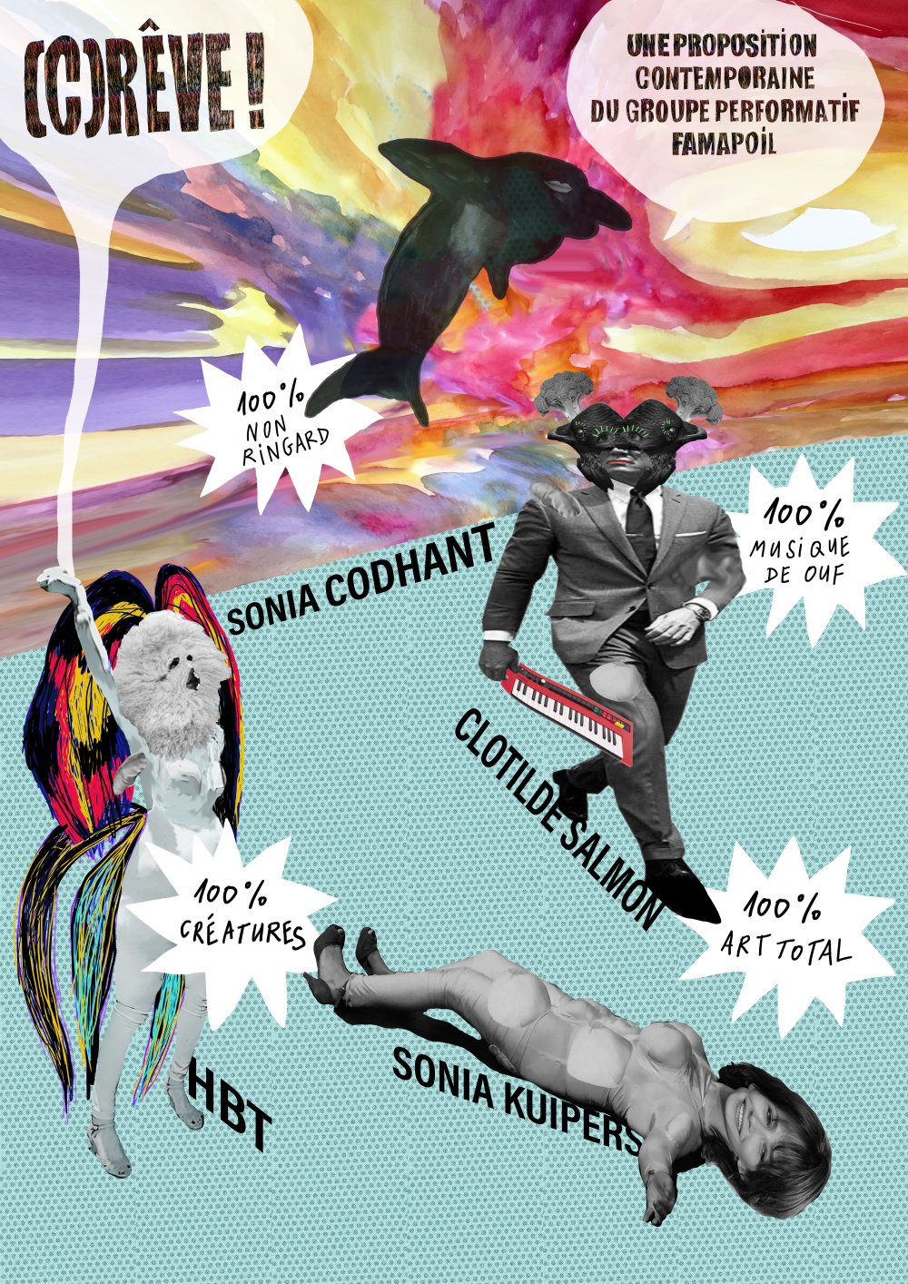C)rêve ! est une performance d’art contemporain qui recrée en temps réel un rêve porté par trois créatures, trois esthétiques et leur medium, la musique de HBT, les dessins de Clotilde Salmon, l’art performatif de Sonia Codhant. Ces trois langages correspondent, se superposent et entrainent le public à travers des tableaux vivants, dédale d’un imaginaire foutraque oscillant entre inquiétude, drôlerie et envoûtement.