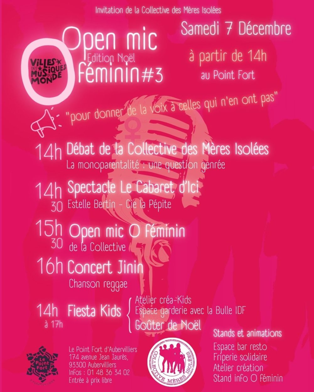 Le 7 décembre, le spectacle est invité au point fort d’Aubervilliers, par la collective des mères isolées pour leur événement Open Mic.