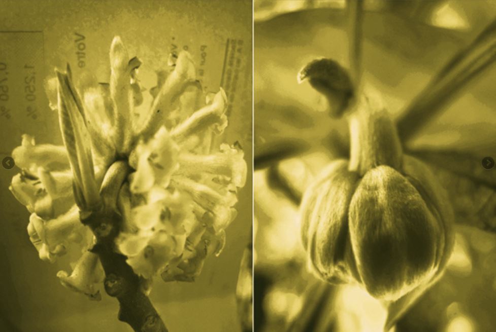 Les papiers sont ensuite empreintés de dessins, de gravures et de peintures, donnant naissance à un jardin infra mince.
