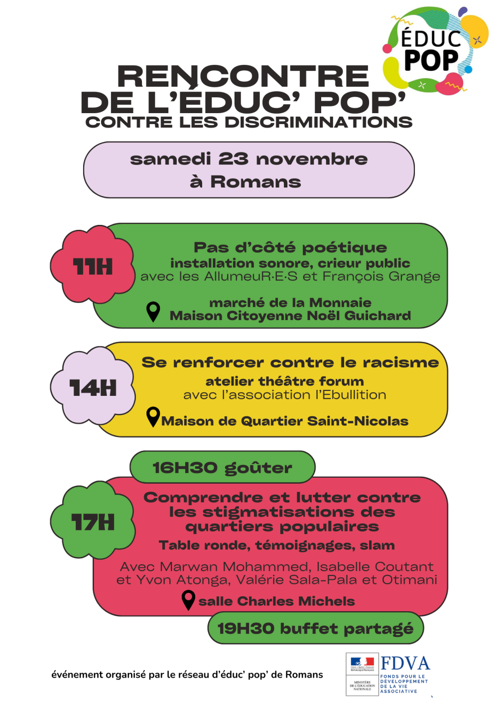 Les Allumeur.e.s sont invité.e.s par le réseau d’éduc’ pop’ romanais qui organise une journée de rencontres autour des actions de lutte contre les discriminations qui souhaite répondre à un besoin de compréhension des phénomènes de violence qui ont touché le territoire trois fois en moins d’un an (Thomas, Zakaria et Nicolas).