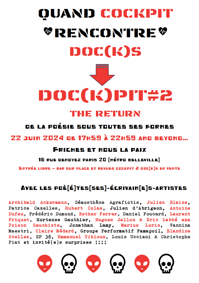 Le GPF présentera sa nouvelle performance « Sortez les violons » à l’occasion de la soirée Doc(k)pit qui réunit Doc(k)s, revue internationale, laboratoire expérimental des langages poétiques et Cockpit, revue de création littéraire et plastique.